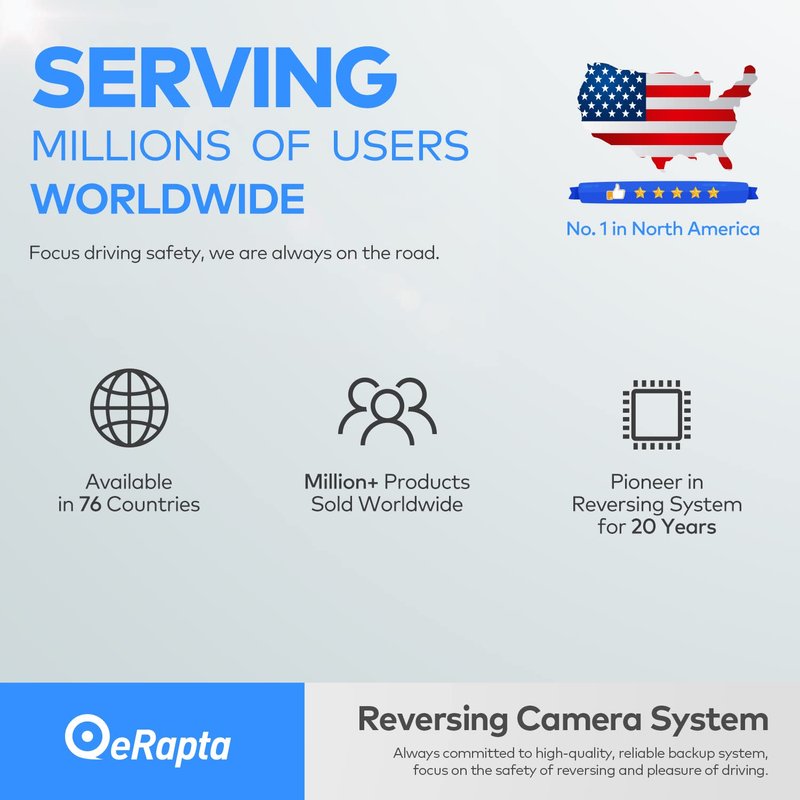 eRapta--Professional team in Amazon, mainly engaged in the business of vehicle. Our mission is to escort every customer's driving anytime and anywhere,breaking through the traditional backup cameras.Based on innovation, to create a number backup cameras,combined with industry advanced technology and high-quality raw materials. eRapta is an industry precedence, committed to providing a satisfying driving experience and service that let customers to drive safely at ease. eRapta ERT01 backup camera :Fits 98% of U.S. Vehicles Wide compatibility (CVBS compatible) with the ultimate waterproof and night-vision back-up camera Camera Dimension: 9.01*0.8*1 inch, Product Weight: 0.61 pounds, Voltage: 12-24V, Current: 400mA, Pixel: 720P, Waterproof Rating: IP69K 149 °Wide View: Camera system with up and down adjustable angle and 149 ° viewing angle of the reversing camera design, show the true dimension of the site to avoid blind spots make parking safer and simpler. Applicable vehicle: Backup camera front camera for car, pickup, truck,SUVs sedans,minivans What you get: 1x Camera,1x Video Cable, 1x Power Cable, 1x Installation Manual. Professional after-sales support, 24 hours online service