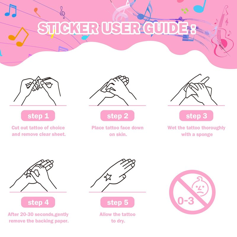 - How to Use: Choose your favorite pattern, then stick it face down on your skin, wet the tattoo with water and wait for 10 seconds. Then gently tear off the white surface, you can get the fun singer music theme birthday party tattoo sticker, which is a great choice for participating in music parties
