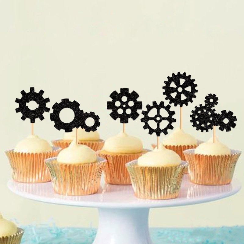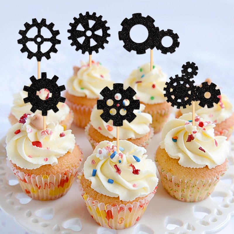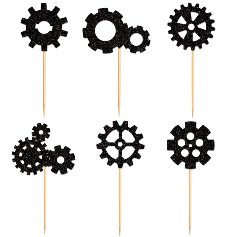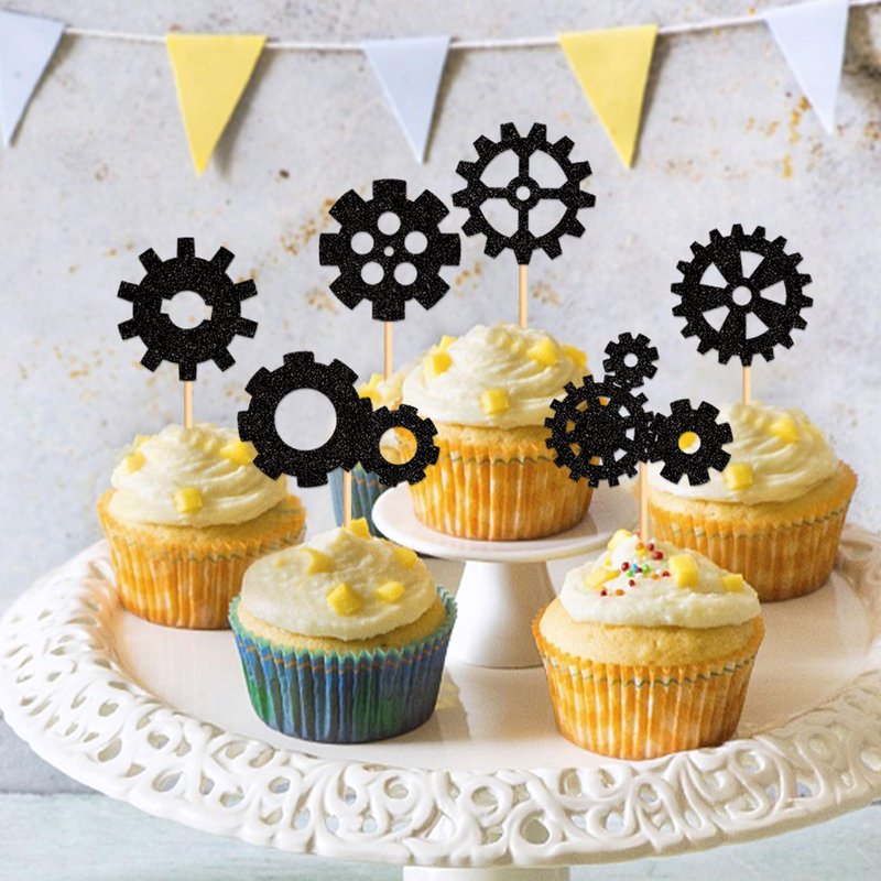 Ercadio 24 Pack Robot Gears Cupcake Toppers Black Cartoon Robot Gears Cupcake Toppers Picks Robot Gear Happy Birthday Cake Decor for Robot Theme Boys Birthday Baby Shower Party Supplies