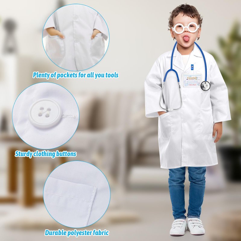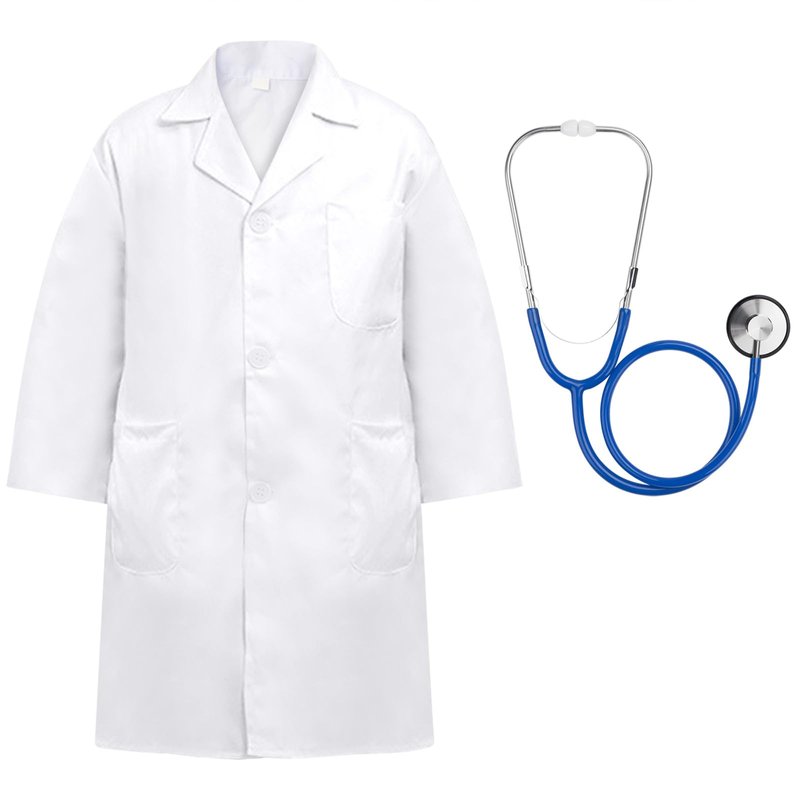 - DOCTOR COSTUME FOR KIDS: The kids doctor costume is includes 1x kids lab coat, 1x toy stethoscope. The white doctor coat features three front pockets, perfect for carrying small things, buttoned front closure, easy to wear. With this scientist costume accessories will make your kids dress up as a real doctor or scientist.