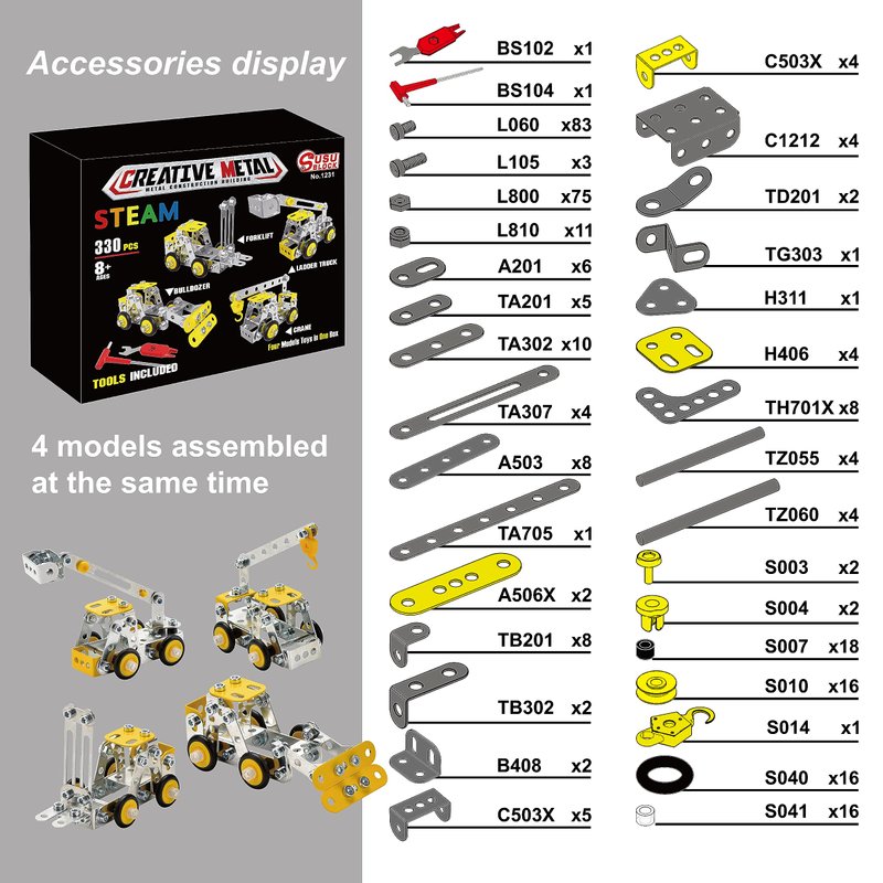 Erector Set for Boys Age 8-12,4 Mini Metal Model Set for Kids,Engineering Metal Building Kit,Learning Construction Truck Building Toys for Boys Age 8-12 DIY STEM Educational Gifts (330pcs)