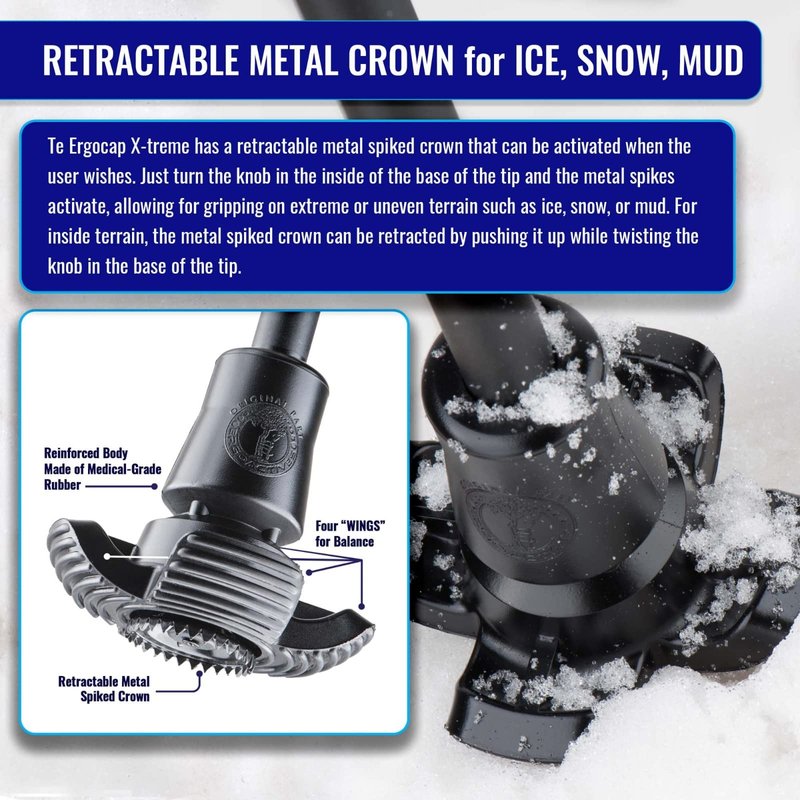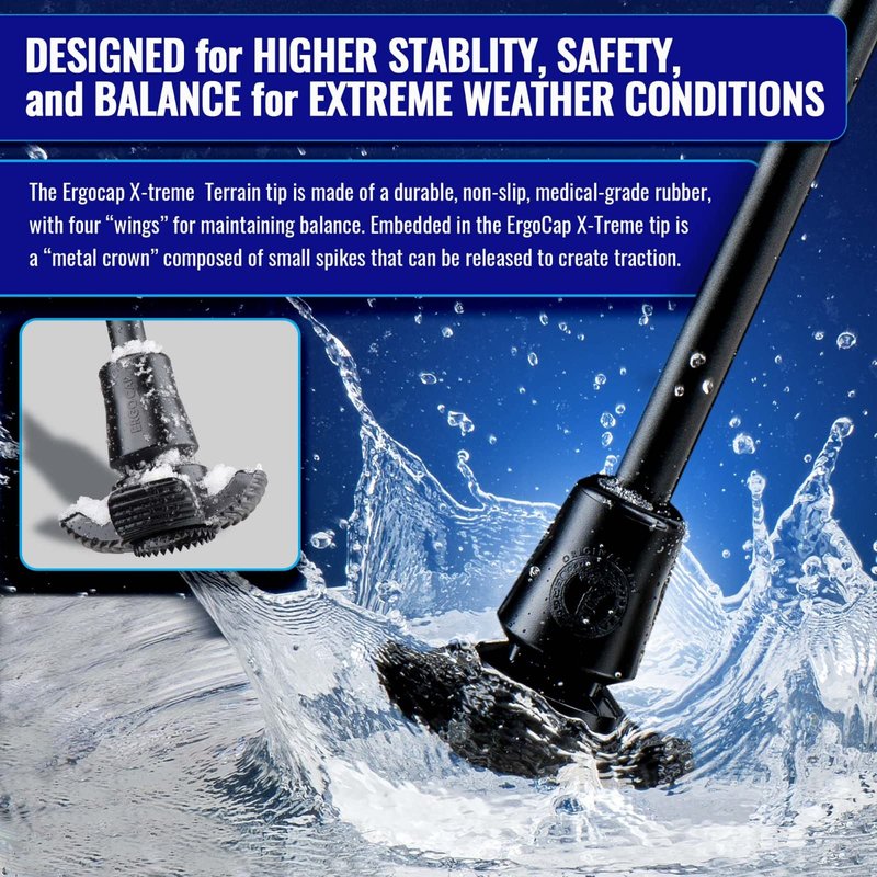 - The ErgoCap X-Treme Terrain tip is made of a durable, anti-slip, medical-grade rubber, with four “wings” for maintaining balance. Embedded in the ErgoCap X-Treme tip is a “metal crown” comprised of small spikes that can be released to create traction.