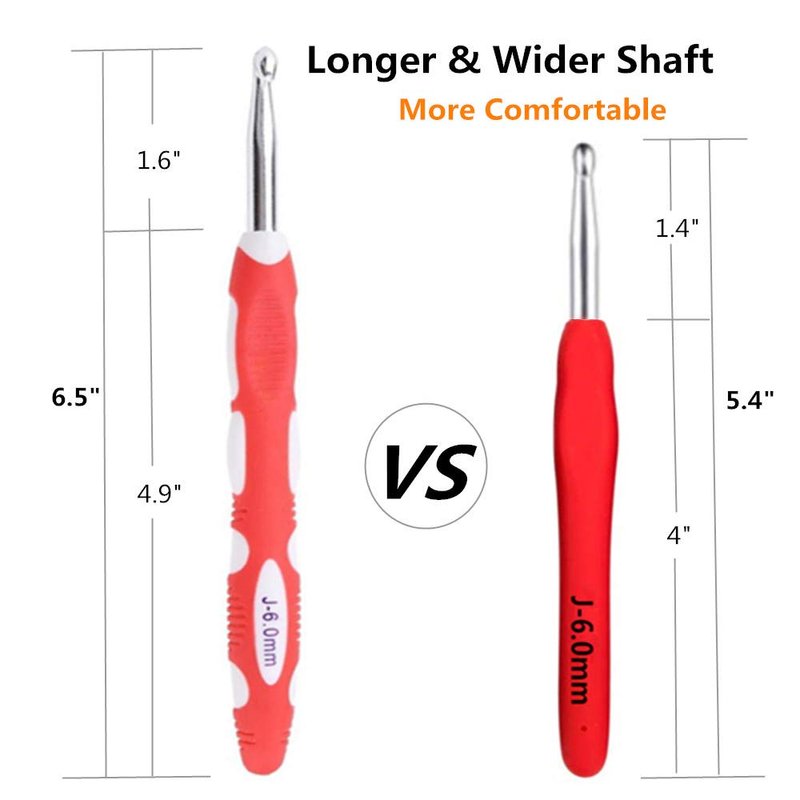 - ღErgonomic Crochet Hooks for Arthritic Hands: The crochet hooks are longer and produced with 5.0 inch long and wider handle than normal hooks, the soft silicone grip will makes you crochet for hours without feeling pain or cramping, plus the non-slip design of thumb part to make the grip firm, which keeps from the hook slipping out of the hand. It is perfect for Arthritic Hands or those with Carpal Tunnel.