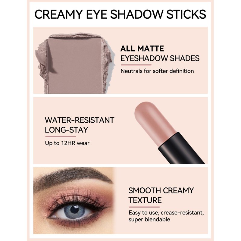 - 【MATTE EYESHADOW STICKS】These soft neutral matte nude colors can be used on the eyelids, eyeliner, inner and outer corners of the eyes, and under the brow bone, suitable for mature women. Highly pigmented eyeshadow stick set, from light to dark, can create smoky or elegant eye makeup.