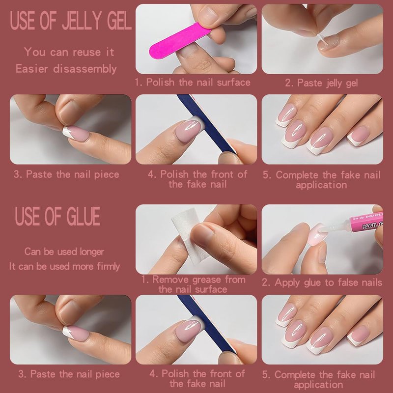 - EASY TO USE---you can use the complimentary jelly gel stickers, fake nails can be reused. However, the jelly gel stickers are not as effective as liquid nail glue. If you want your artificial nails to last longer, you can use liquid nail glue, which lasts 1-2 weeks.