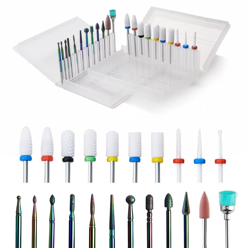 22 pcs Nail Drill Bits Sets rofessional Nail Drill Bits Set - Include 5pcs ceramic drill bits; 10pcs rainbow diamond carbide drill; 1pcs Brush ,1pcs Silicone bit, This kit includes almost all the nail drill tools that you may needed for nail art. Suitable for professional manicurist or nail art beginner.