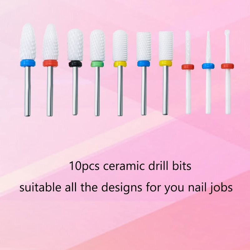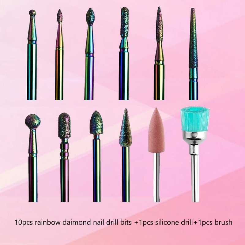 - 22 pcs Nail Drill Bits Sets rofessional Nail Drill Bits Set - Include 5pcs ceramic drill bits; 10pcs rainbow diamond carbide drill; 1pcs Brush ,1pcs Silicone bit, This kit includes almost all the nail drill tools that you may needed for nail art. Suitable for professional manicurist or nail art beginner.
