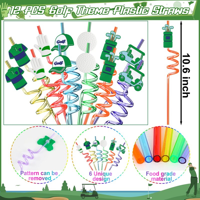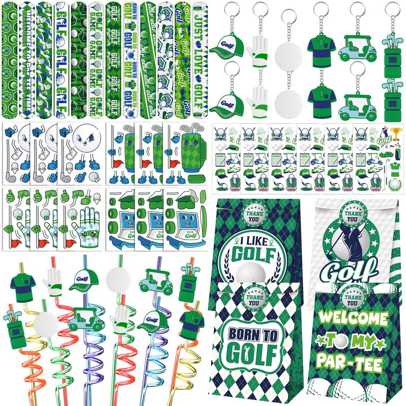 - PACKAGE INCLUDE - Golf party favors includes 12 PCS Slap Bracelets(12 styles), 12 PCS DIY Stickers(4 styles), 12 PCS Temporary Tattoos, 12 PCS Keychains(6 styles), 12 PCS Plastic Straws(6 styles) and 12 PCS Gift Bags(4 styles). Enough quantity to meet your party need.