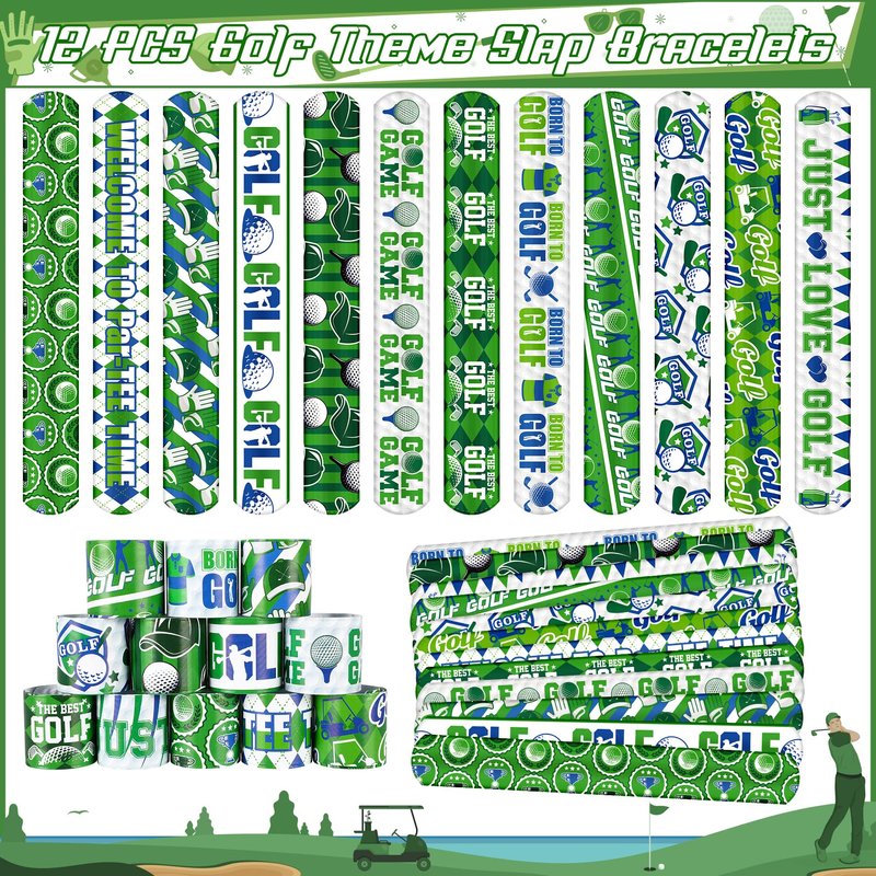 Golf party favors includes 12 PCS Slap Bracelets(12 styles), 12 PCS DIY Stickers(4 styles), 12 PCS Temporary Tattoos, 12 PCS Keychains(6 styles), 12 PCS Plastic Straws(6 styles) and 12 PCS Gift Bags(4 styles). Enough quantity to meet your party need.