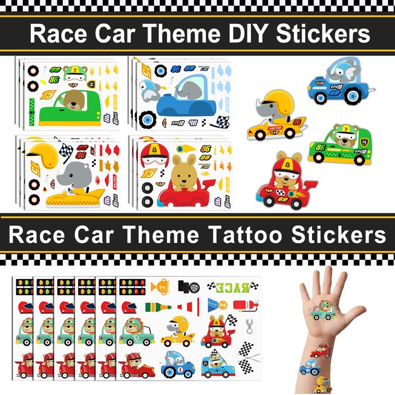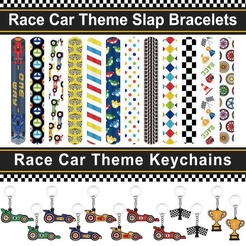- PACKAGE INCLUDES- Race Car Party Favors Set includes 12 PCS Mini Race Cars Toys, 12 PCS Car Keychains, 12 PCS Slap Bracelets, 12 PCS DIY Stickers, 12 PCS Tattoo Stickers, 12 PCS Car Straws and 12 PCS Treat Candy Bags.