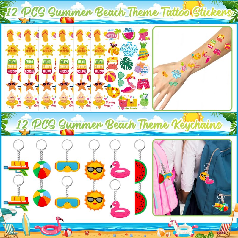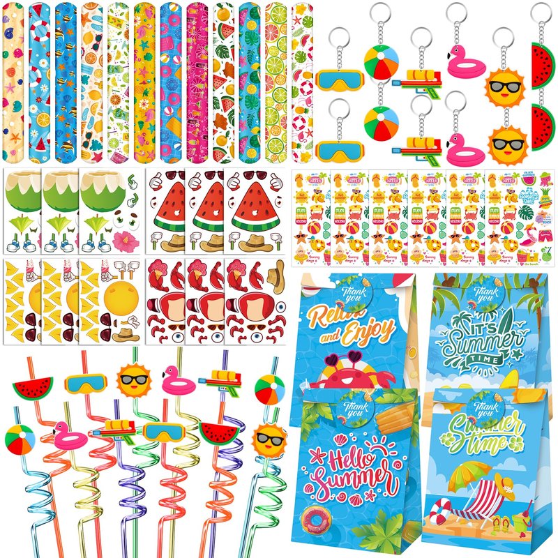 - PACKAGE INCLUDE - Summer beach party favors includes 12 PCS Slap Bracelets(12 styles), 12 PCS DIY Stickers(4 styles), 12 PCS Temporary Tattoos, 12 PCS Keychains(6 styles), 12 PCS Plastic Straws(6 styles) and 12 PCS Gift Bags(2 styles). Enough quantity to meet your party need.