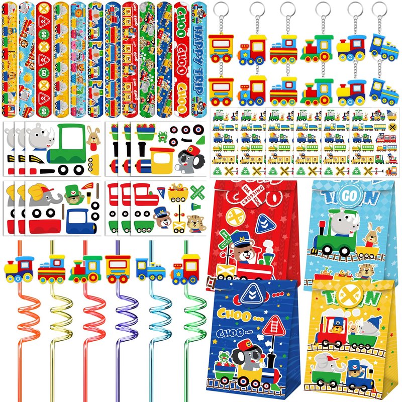 - PACKAGE INCLUDE - Train party favors includes 12 PCS Slap Bracelets, 12 PCS DIY Stickers(4 styles), 12 PCS Temporary Tattoos, 12 PCS Keychains(6 styles), 12 PCS Plastic Straws(6 styles) and 12 PCS Gift Bags(4 styles). Enough quantity to meet your party need.