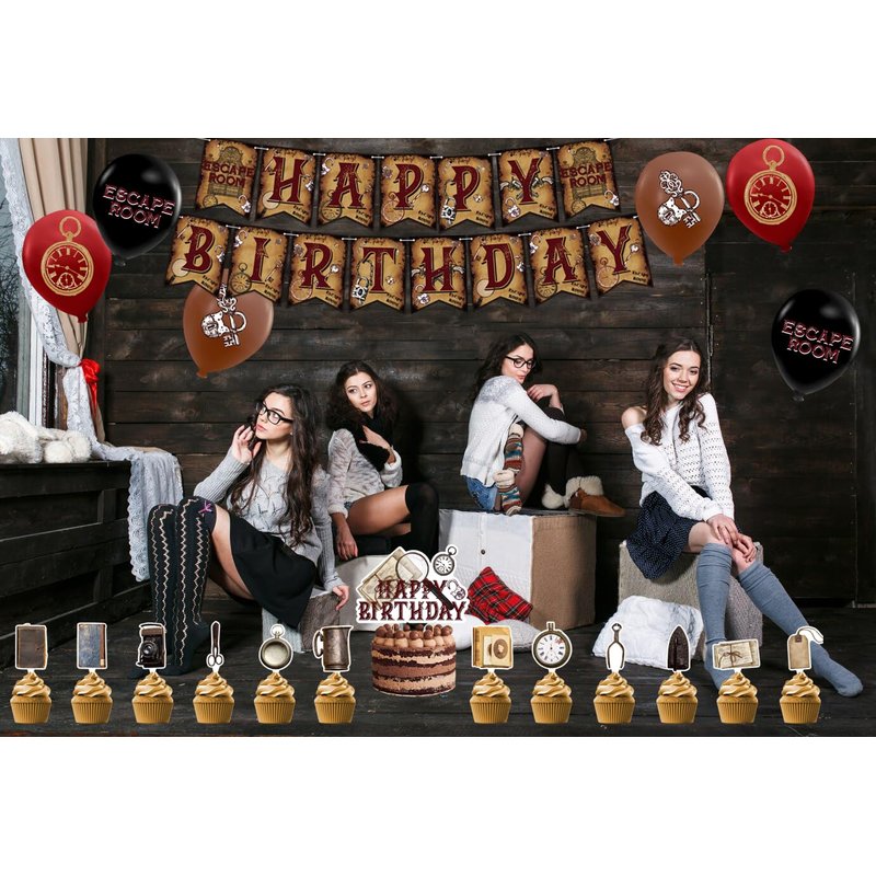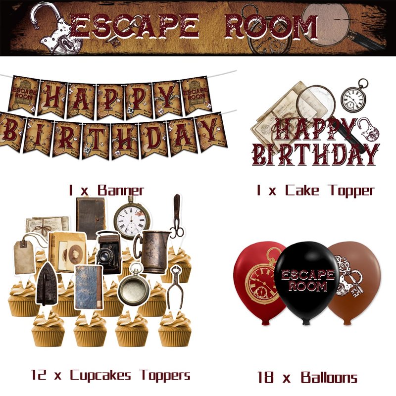 - Escape Room Party Supplies: You will get 1 * HAPPY BIRTHDAY banner, 1 * cake topper, 12 * cupcake toppers, 18 * latex balloons, 1 ribbon. Mysterious and unique party decorations will bring unimaginable splendor to your party.