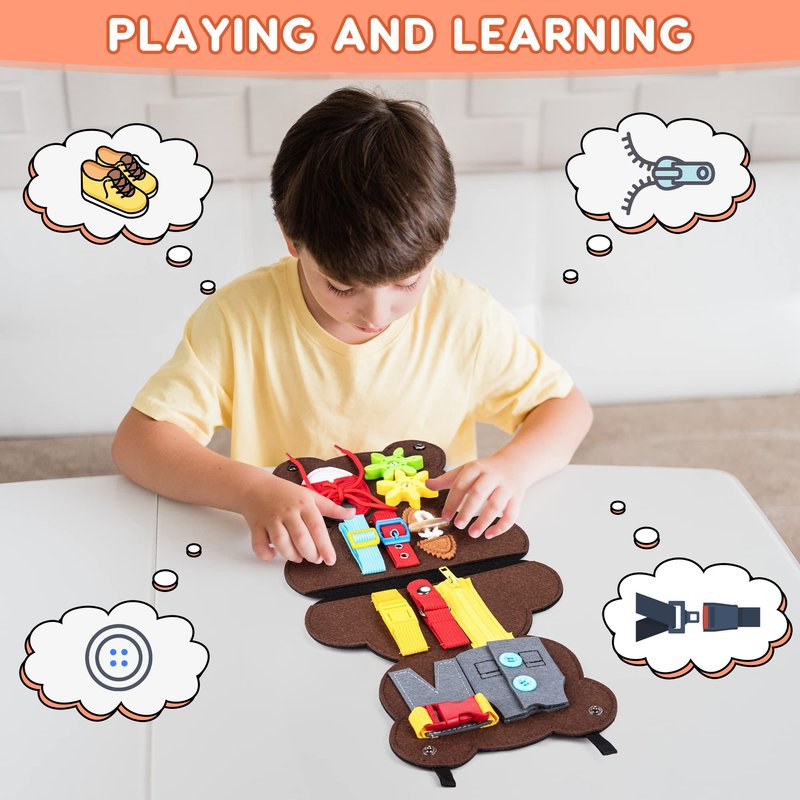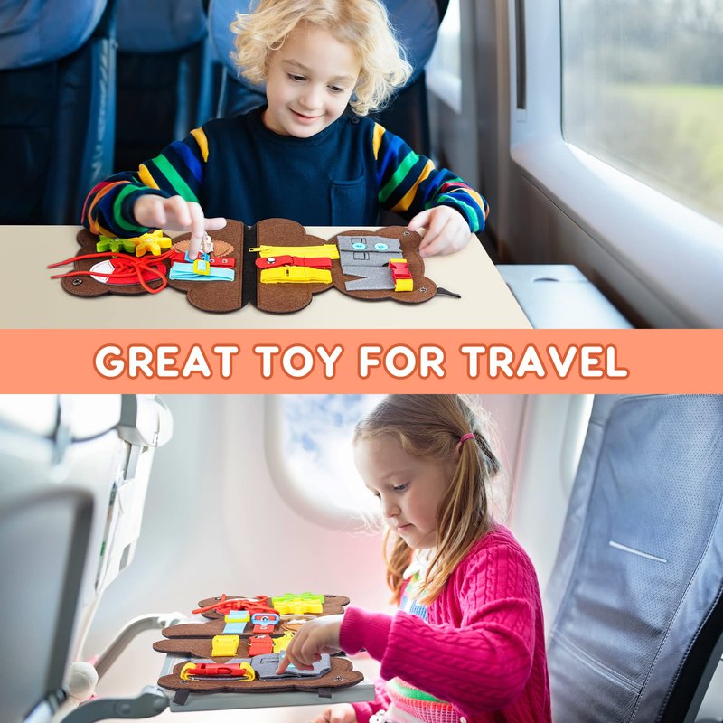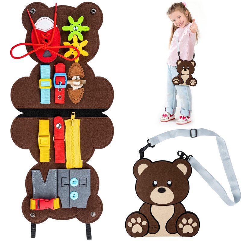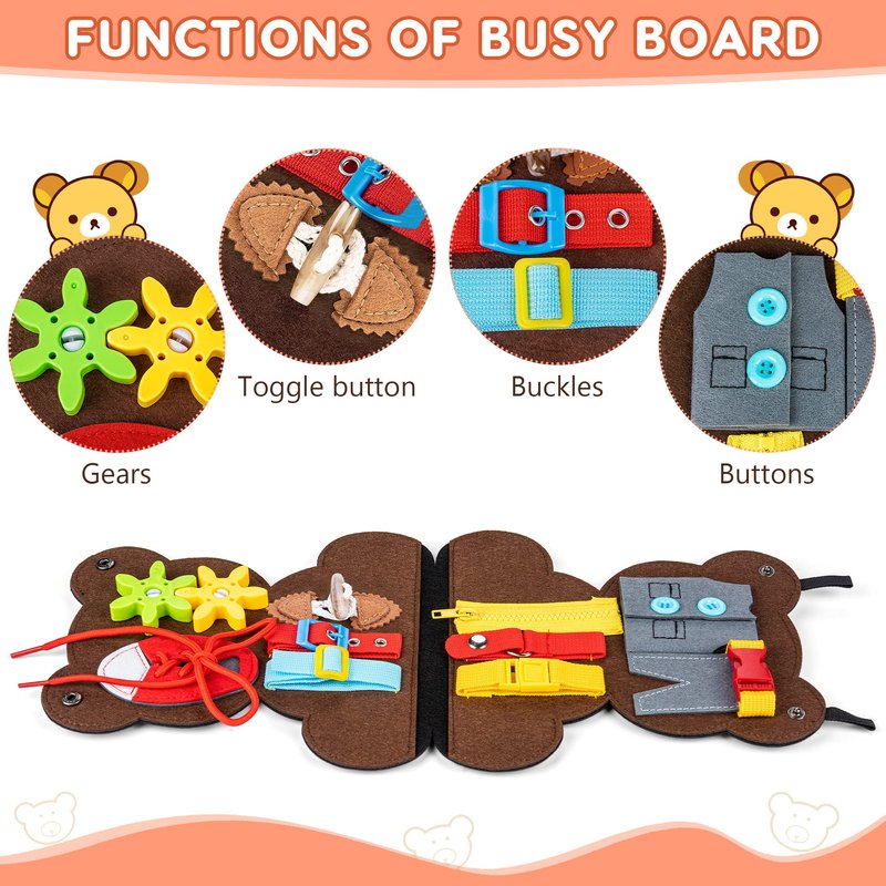 - [Fun And Unique Design] Our Busy Board Is Teddy Bear Shaped While Others Are Standard Squares. Our Teddy Bear Shape Design Will Encourage Your Toddler To Learn And Play While Keeping Their Attention. Our Busy Board Includes 10 Activities For Your Child To Practice Fine Motor Skills And Sensory While Thinking And Problem Solving!