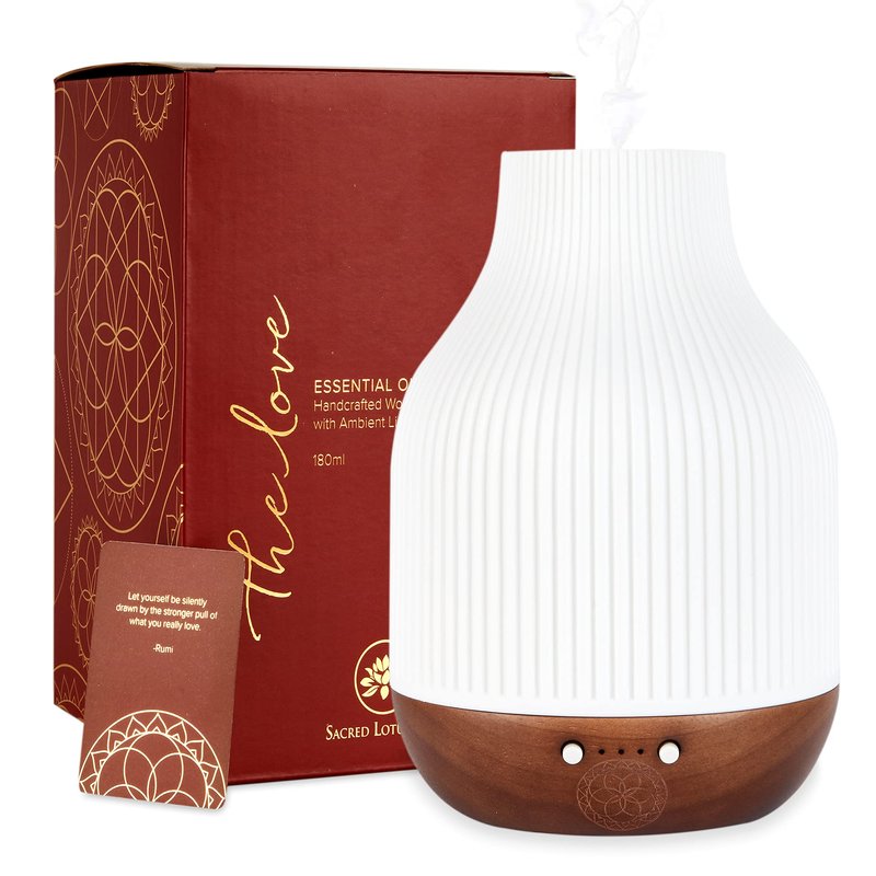 - HIGH-QUALITY essential oil diffuser, and also a stylish, minimalistic lamp. The ambient light creates a beautiful atmosphere that is fully customizable with 5 light controls including soft, bright, breathing, sleep helper + on/off. The natural wood base is engraved with a subtle Love Anahata Symbol.