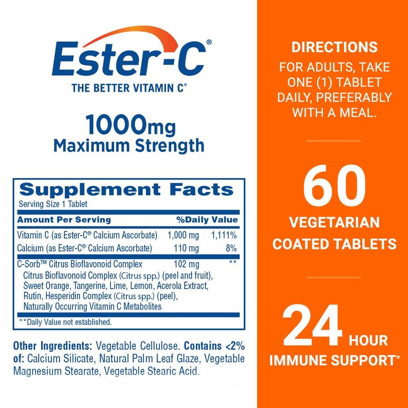 - Ester-C 1000mg tablets provide the immune support you can count on all day, every day(1); A daily dose of Ester-C tablets gets absorbed into your white blood cells and stays there, for up to 24 hours, which is longer than regular Vitamin C supplements (2)