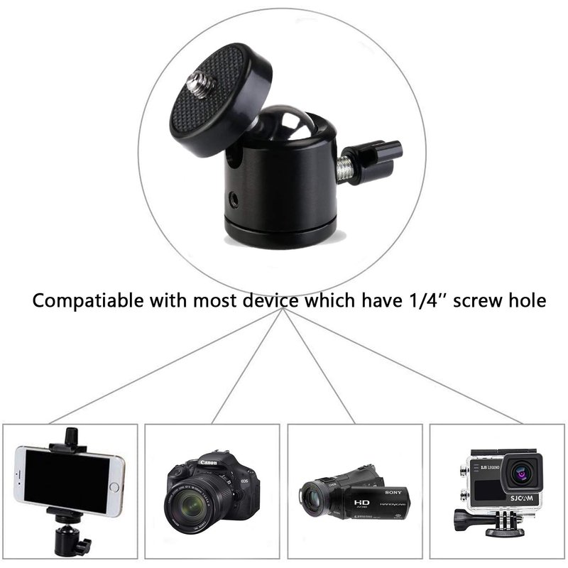 - ✅WIDE APPLICATION: The top with 1/4'' male thread , bottom with 1/4'' female thread hole, This tripod ball head set can be used for cameras, or other devices that with standard 1/4" thread hole. such as: camera, projector, flash light, light stand, tripod etc.