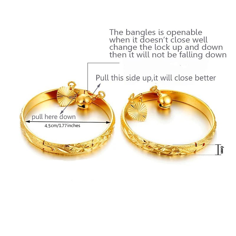 - Premium Craftsmanship: Our bangles are expertly crafted with durable materials, featuring a highly polished 18K vacuum gold plating over copper. Adopting Color Preserving Electroplating Process,Lead-free and nickel-free .This combination ensures longevity and use safety , and adds a touch of luxury to your child's ensemble.