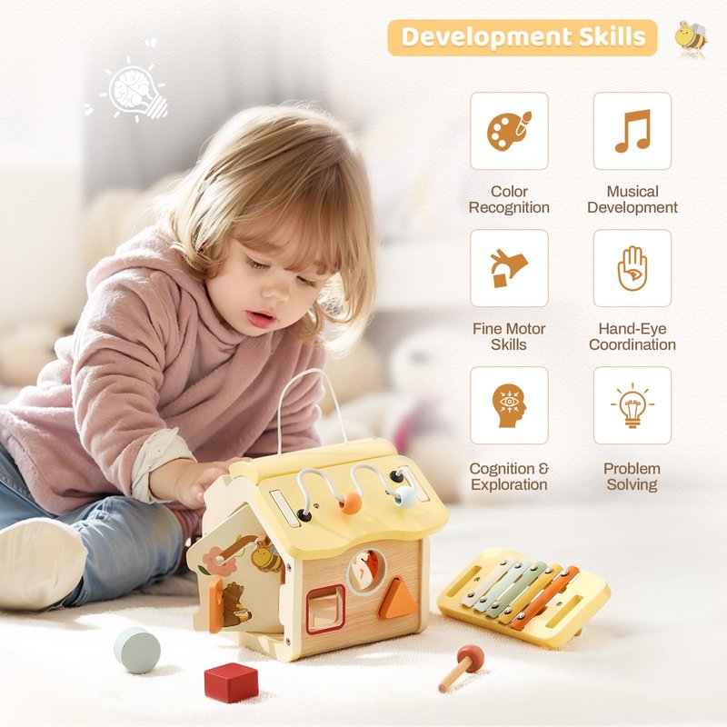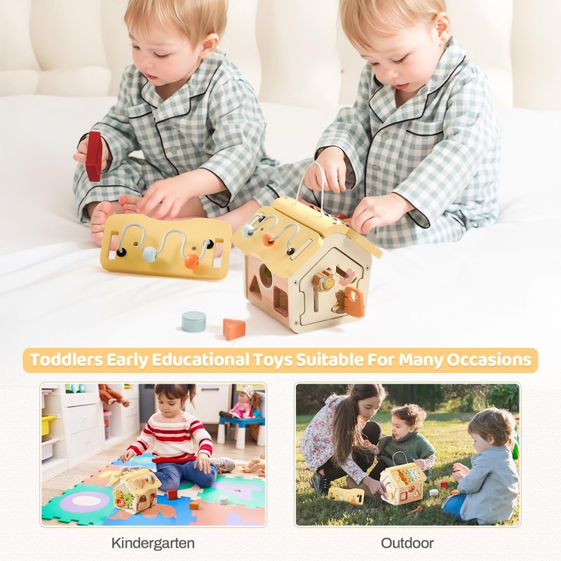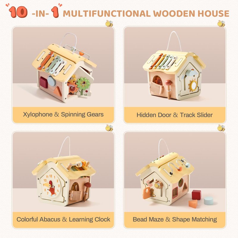 - 🏠10-in-1 House Busy Cube: Combines more than a dozen different ways of playing into a busy wooden house toy, including xylophone, bead maze, colorful abacus, screws, learning clock, rotating gears, hidden doors, track sliders, shape matching, scraper, small mirrors, etc. Dynamic and creative Montessori toys stimulate baby's desire to explore and hand-eye coordination ability