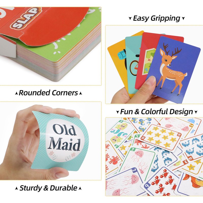 - Classic Card Games Set: 4 Decks in 1 pack card set contains four different games: Go Fish, Old Maid, Memory Match and Slap Jack. The game is designed around four different themes - marine animals, professions, fun food, and camping—By linking with the categories of the real world, games can be made more attractive and educational