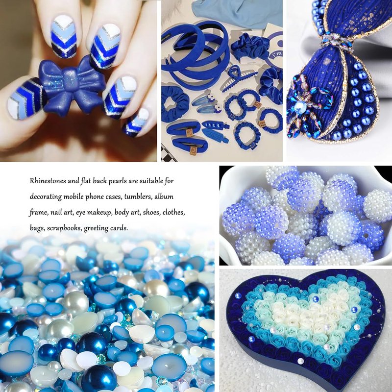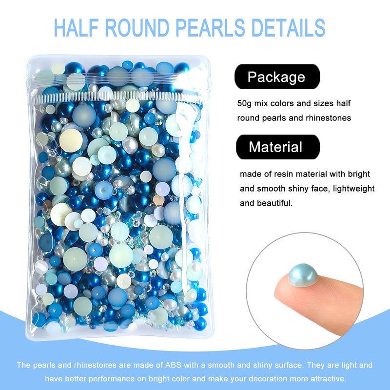 Euddty 50g Flatback Pearls and AB Rhinestones Set Half Pearls for Crafts Mixed Size 3mm-10mm Flat Back Pearl for Nail Art and Crafts and Decoration (Blue Series)