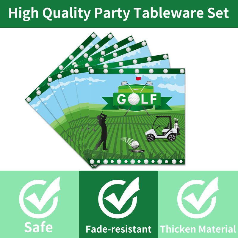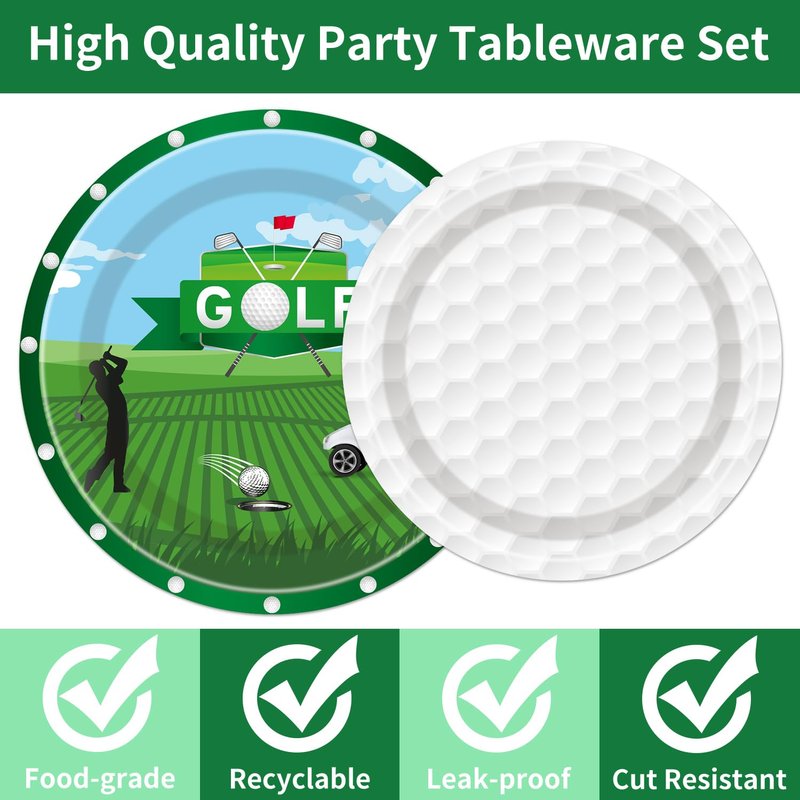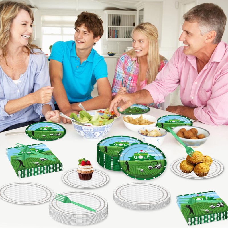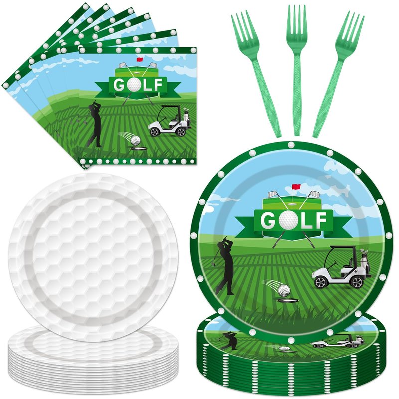 - Golf Plates and Napkins Party Supplies Serves 24:This Golf themed birthday party decorations set includes everything you need for 24 guests: 24 large plates (9 inches), 24 small plates (7 inches), 24 napkins, and 24 forks, totaling 96 pieces. Perfect for a fun-filled sports-themed party
