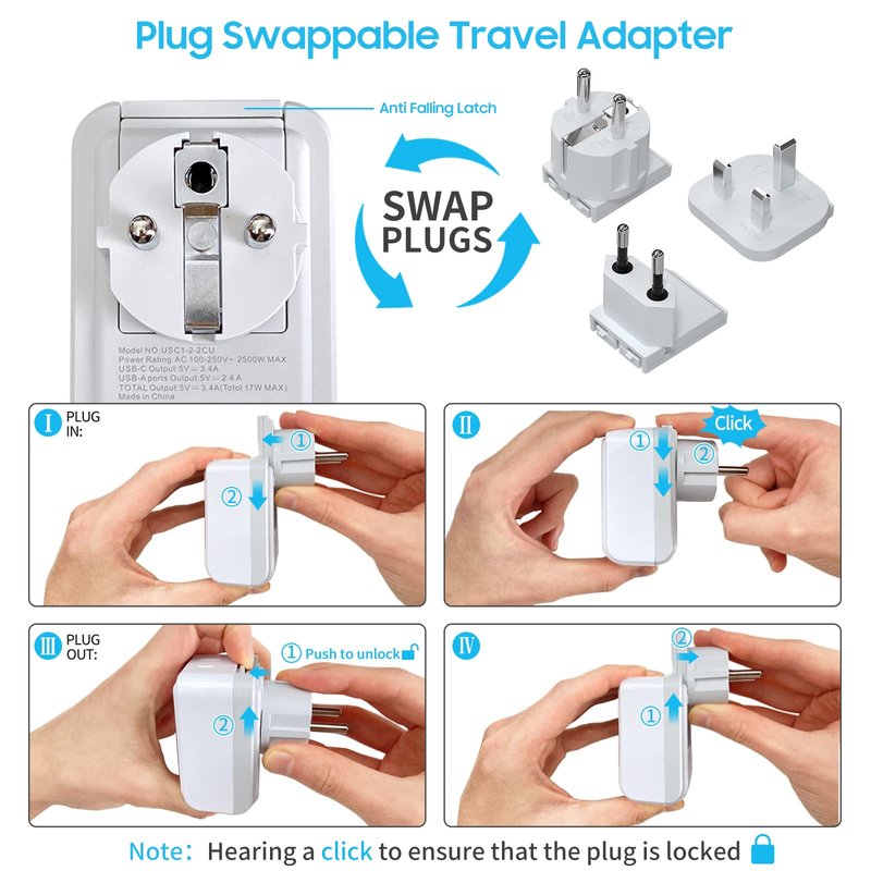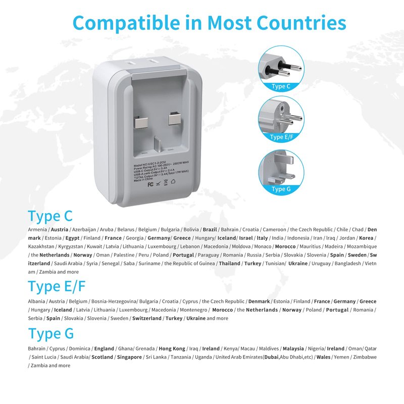 - 5 in 1 US to Europe Plug Adapter: Upgraded Europe travel adapter turns Type C,G,E/F socket into 2 standard USA sockets(2500W max at 250V) and 3 USB ports(17W max), USB port charging up to 2.4A(12W), dual USB C port charging up to 3.4A(17W), owing you charge 5 devices at a higher rate simultaneously, no need to carry extra adapter and power strip for your traveling. Ideal for Cell Phone, iPad, Kindle, Laptop, GoPro, Camera, Power Bank, etc