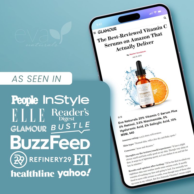 Eva Naturals' Vitamin C Plus Serum is a multifaceted skincare product designed to rejuvenate and protect the skin. It combines Vitamin C to help repair sun-damaged skin, with Hyaluronic Acid for deep hydration. Retinol contributes to clearer pores and reduced breakouts, while Niacinamide works to even skin tone and Salicylic Acid facilitates gentle exfoliation. This serum is formulated to promote a smoother, more youthful complexion, addressing blemishes and redness, making it suitable for all skin types.