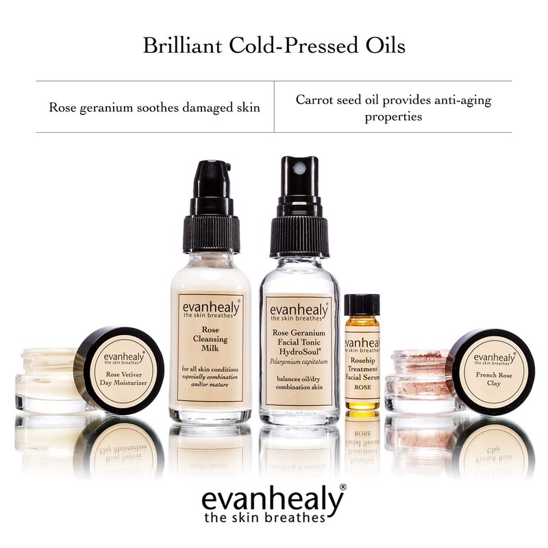 - SKIN TRINITY - Contains 5 travel-size essentials for the evanhealy oil water clay ritual: Rose Cleansing Milk organic face wash, Rose Geranium Facial Tonic HydroSoul, Rosehip Facial Serum ~ Rose, Rose Vetiver Day Cream, and French Rose clay face mask.