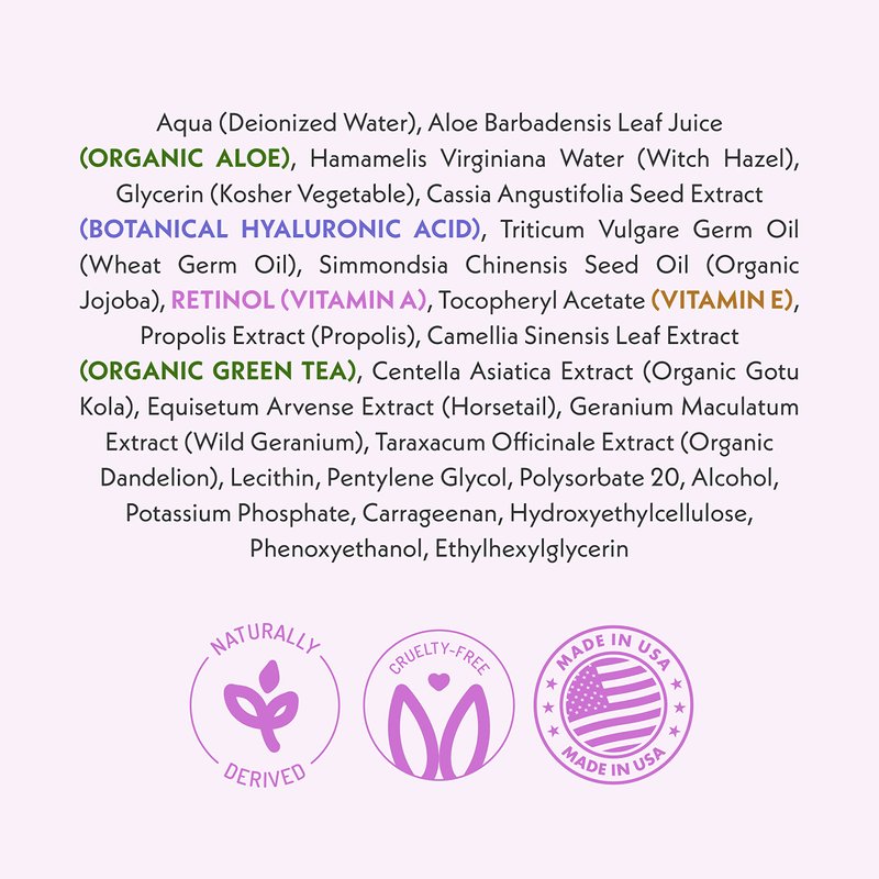 - Infusion of Botanic Antioxidants - Our retinol moisturizer serum is made with skin healing ingredients including jojoba oil organic, Vitamin E, witch hazel, and organic aloe to make the ultimate hydrating serum sun spot remover for face
