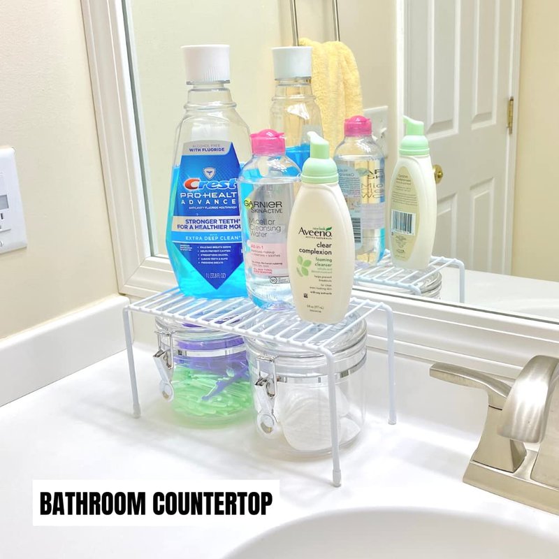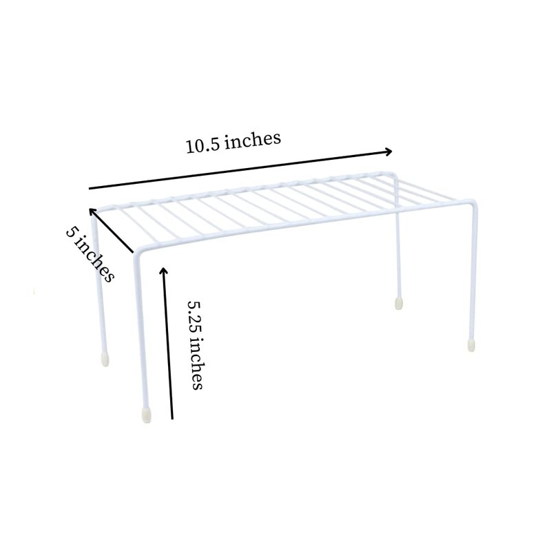 Double your kitchen, bath, or closet storage space with Evelots Mini Storage Shelves! Versatile shelves hold food, dishes, small appliances, pantry staples, cans, toiletries, cleaning products, or anything you need to store in a small space. Set of 2 shelf organizers double your cabinet space. Each measures approximately 10.5 Inches Long x 5 Inches Wide x 5.25 Inches High.