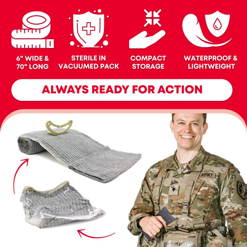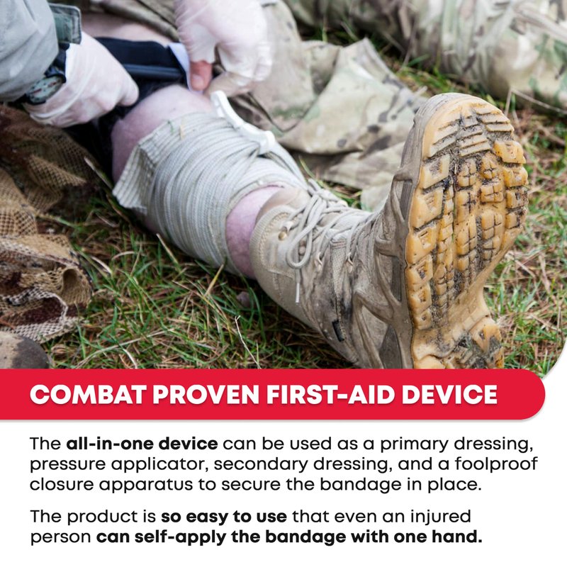 Combat medics, trauma doctors, and emergency responders all recommend this Israeli Battle Dressing (IBD) or Israeli Emergency Bandage for the treatment of gunshot wounds, puncture wounds, deep cuts, and other traumatic hemorrhagic injuries. In fact, this is the same bandage that is included in the U.S. Military's IFAK, or individual first aid kit. This is the large, six-inch bandage, and can be used one-handed for self-treatment or can be applied by a care giver or first responder to help staunch blood flow and stabilize the patient for evacuation or treatment. It can be used on the head, leg, arm, torso, or elsewhere on the body. Although primarily designed to help staunch blood flow by applying pressure to the wound site, the 70-inch long elastic portion of the bandage can also be used in the field to construct a sling, to bind a strain or sprain, to secure splints to the broken limb, or even as an improvised tourniquet. The IBD is self contained. It does not require clips, Velcro or pins to use and there are no loose parts that can get lost or misplaced in an emergency. Specifications-Israeli Battle Dressing (IBD) - Size 6' Inches Wide and 70' Inches Long. For The Treatment of Traumatic Hemorrhagic Injuries. Vacuum Packaged and Sterile. X-Ray friendly. Small Enough To Carry In Your Pocket. Instructions For Use Is On The Back-Size packed: 8 x 5 in. (20.32 x 12.7 cm) Weight: 3.5 oz. (99.2 g). Significant time, space, and cost savings. Made to stop uncontrollable bleeding. Highly Recommended Piece of Safety Gear For Those Going Camping, Hunting, Hiking, etc. Secure, water-resistant closure bar.