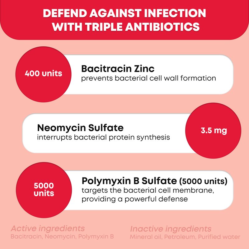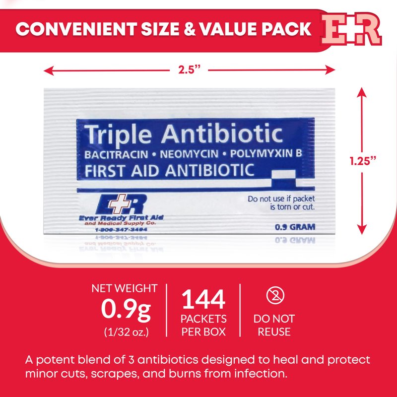 - TRIPLE ANTIBIOTIC - Each 0.9 gram packets of triple antibiotic ointment contain Bacitracin, Neomycin, & Polymyxin B.