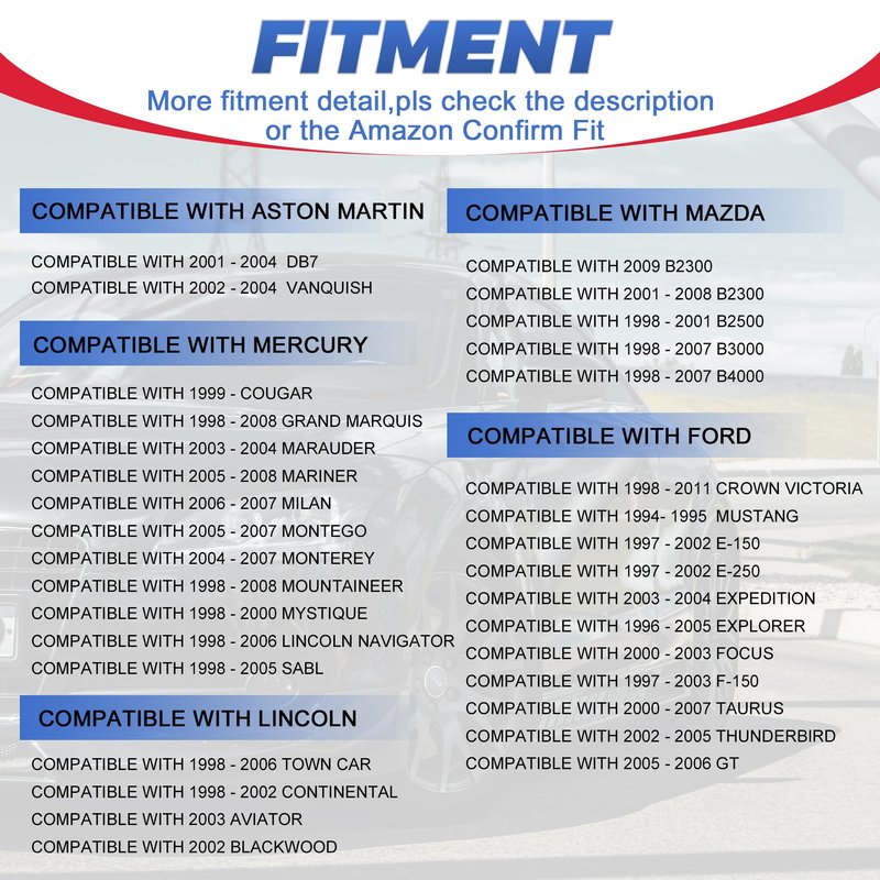 - [Vehicle Fitment]- Compatible with 1990-2014 FORD E-250; Compatible with 1990-2015 FORD E-350; Compatible with 2000-2015 FORD E-450; Compatible with 2002-2003 FORD E-550; Compatible with 1997-1999 FORD ECONOLINE SUPER DUTY; Compatible with 2005-2010 FORD ESCAPE; Compatible with 1990-2010 FORD F-150; Compatible with1990-1999 FORD F-250(Details are below,Please check your car informantion before purchase)