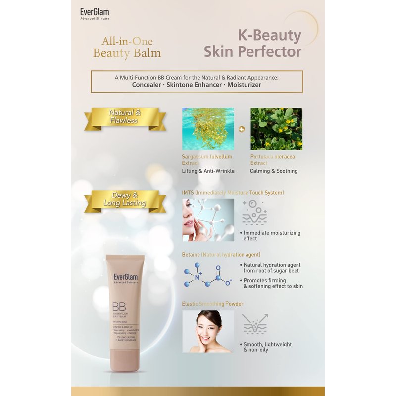 EverGlam K-Beauty Skin Perfector Korean BB Cream, Light Medium - Flawless, Natural Glow in Seconds | Multi-Function Tinted Moisturizer: Stays On All Day, Dewy, Water-Resistant, Oil-Controlling
