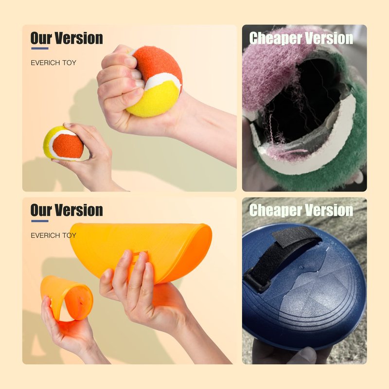 The catch ball is poor and hard, the hand will be a pain when we catch the ball. In response to these situations, our design department perfectly avoided these defects. The toss and catch ball set improved is more durable and stronger.