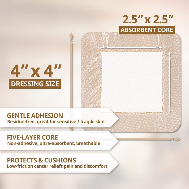 - ✅【5-LAYER DESIGN FOR BETTER ABSORPTION】- Ultra-absorbent core locks exudate away from wound and reduces skin infiltration. The five-layer construction keeps wound at an appropriate temperature and humidity for accelerated healing.