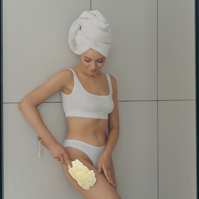 - TONING CLEANSING: Eliminate dead skin cells and get healthier, smoother and more glowing skin in the blink of an eye with this body scrub sponge. The long handle allows you to access hard-to-reach areas like the middle of your back