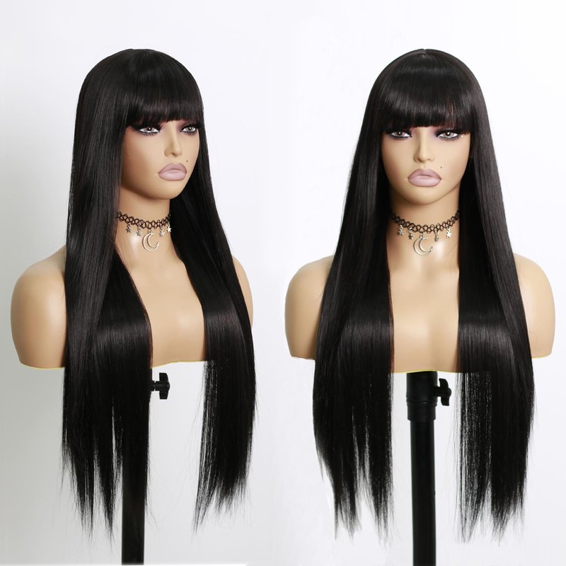 EVLYNN Black Wigs With Bangs Straight for Fashion Women 26 Inch Ombre Color Wig Heat Resistant Synthetic Fiber Hair Long Glueless Wig For Women