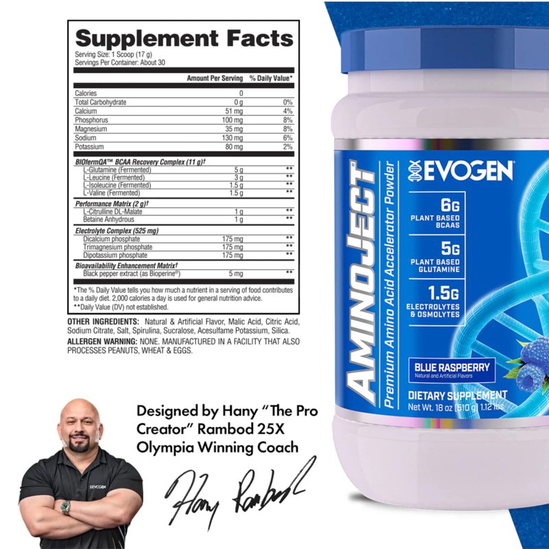 Evogen AminoJect - Amino Acid Accelerator Powder | Supports Muscle Recovery & Hydration | Plant-Based BCAAs, Glutamine, Electrolytes | Blue Raspberry | 30 Servings