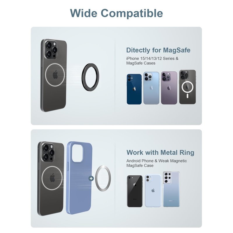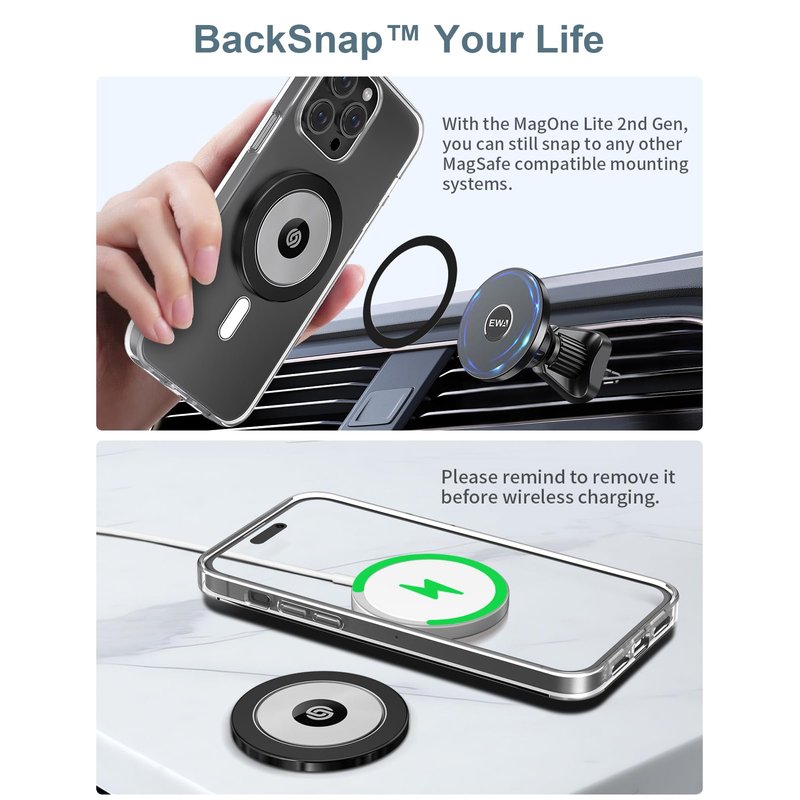 - 【Magnetic Snap Bridge】 With the BackSnap, you can also snap to other Magnetic accessories with the ring stay on phone, like Apple Wallet, wall mount, car mount. Please apply the silicone ring adaptor on your car mount if the product always end up attached to the car mount when detaching your phone. (Warning: Please make sure to use this product with a magnetic phone case when using on car mount.) Please remind to remove MagOne Solo with a slide before wireless charging.