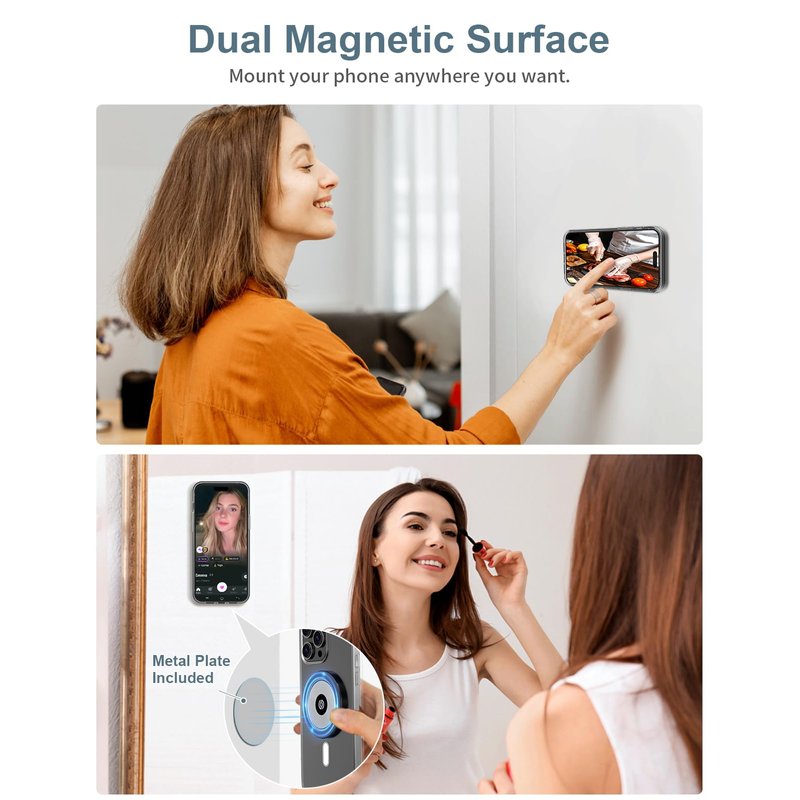 - 【BackSnap Pro Your Life】 Dual-Sided Magnetic makes both sides of the grip have magnetic functions! The side that attaches to the phone can hold weight of 6 iPhone 15, and the back can stuck to any iron surface (like fitness equipment, refrigerator, or metal shelves) and any non-iron surface (like mirror, bathroom, or wood furniture) with the iron sheet included. Freeing your hands for your phone viewing. Easily detachable.