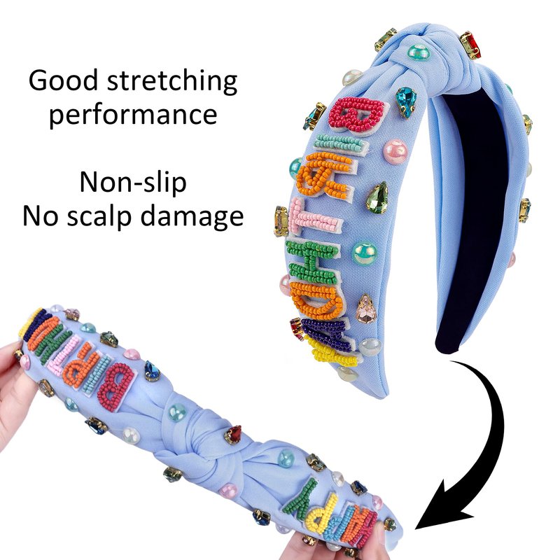 - 4.Stylish Knotted Top Design: A charming knot design gracefully crowns the top of the headband, not only enhancing its visual appeal but also ensuring a secure placement that stays put throughout the day. This stylish element adds a touch of boho chic to any ensemble.
