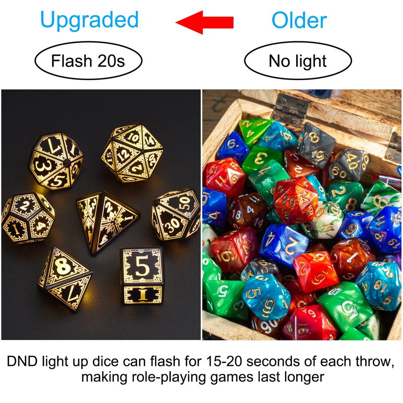 - Light up Dice for Game Lovers: glowing dice built-in LED lamp beads; gorgeous appearance bring endless fun to any dice game, such as RPG, Board Games, Parties, Parent-Child Activities; Perfect for holiday parties or as a perfect gift for game players