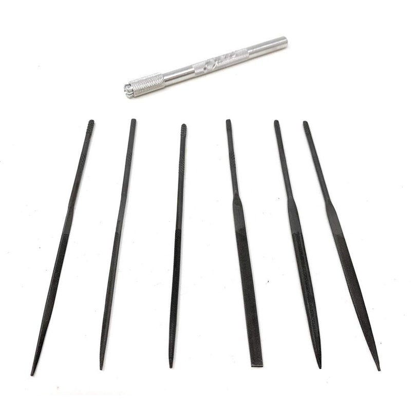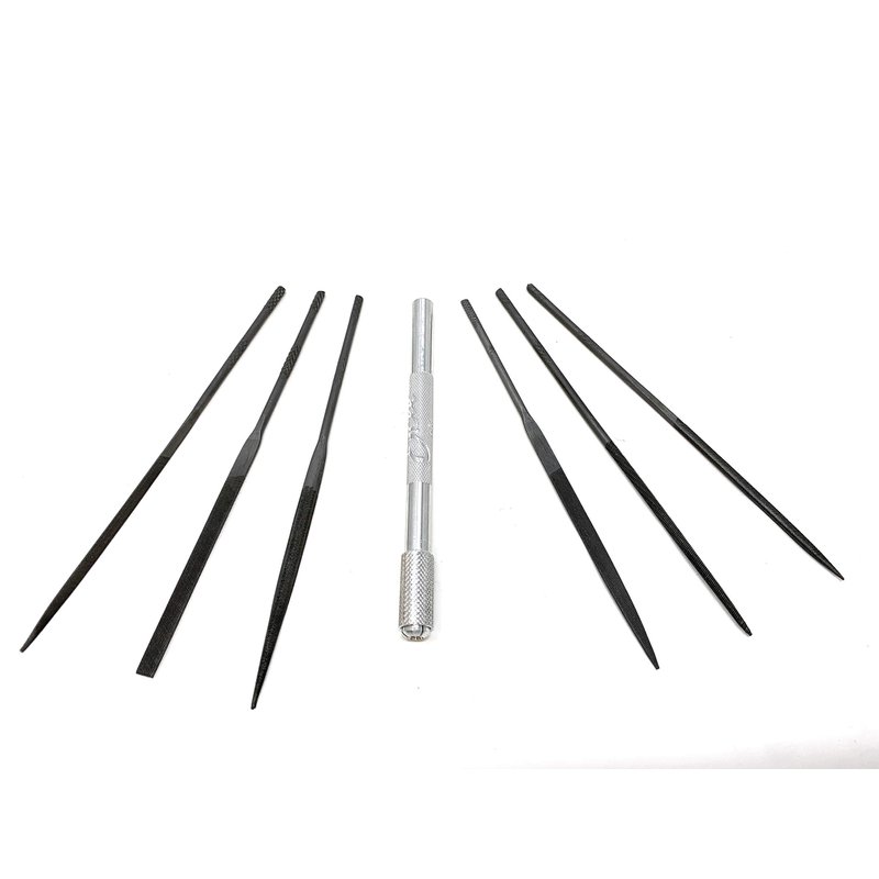 - Contains one each of the square, round, three square, half round, knife and flat files plus one interchangeable aluminum handle