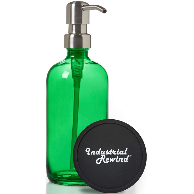 - This bankers Green 16oz heavy glass bottle paired with our commercial quality stainless steel metal soap dispenser pump radiates class and quality wherever you place it in your home or business. Comes with Industrial Rewind Coaster for Non Slip Bottom and Countertop Protector.