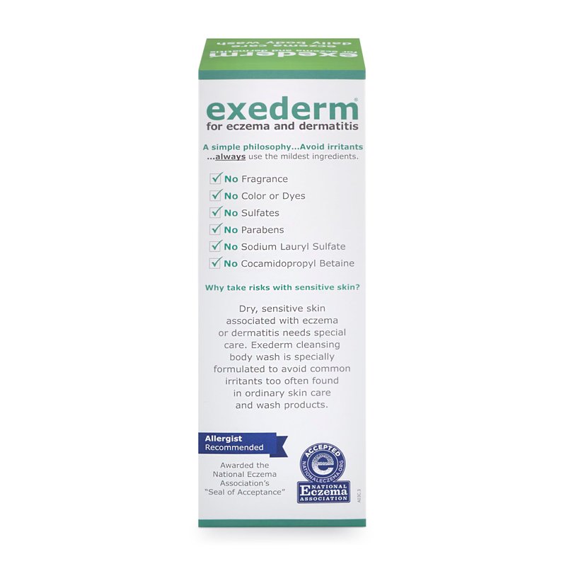 Exederm Body Wash is specially designed for the most sensitive skin associated with eczema and dermatitis. The product is also suitable for facial use. This product avoids harsh additives and unnecessary foaming and 'bubbling' agents which can irritate sensitive skin. Color & Dye Free. Fragrance Free. Parabens Free. SLS (Sodium Lauryl Sulphate) Free. Formaldehyde Free.
