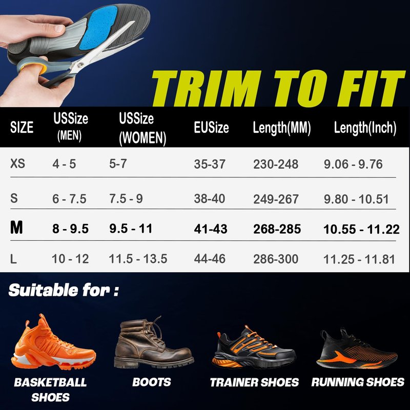 - * VERSATILE FIT: Suitable for both men and women, our insoles fit a wide variety of shoe types, from work boots to casual shoes and athletic trainers.