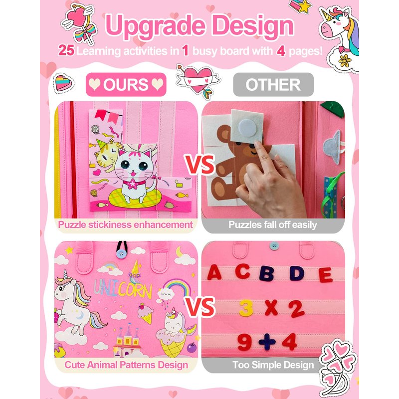 Exorany Pink Unicorn Busy Board - Montessori Toy for 1-4 Year Old Toddlers Specially designed for 1-4 year old preschool kids to develop dressing skills, finger dexterity, and cognitive skill through playing. In addition, the lightweight and portable design enables children to keep busy during the journey and stay away from electronic products. An amazing gift choice for Birthday, Easter, Children’s Day, Back to School and Christmas. Give your little loved ones a great surprise!