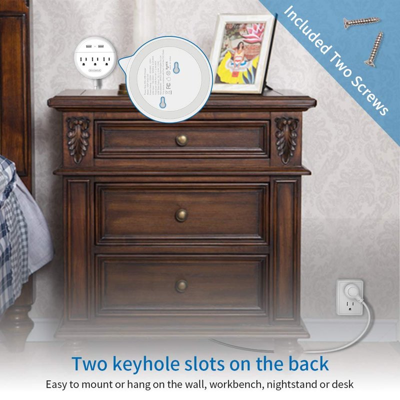 - [SPACE SAVING]: wall mountable power strip with 25 ft cord has holes on the back and adhesive sticker pads for wall-mounted options,so you can mount it on a wall,nightstand or desk,no more running messy tangled wires down to the floor outlet.